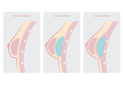 Implants can be placed in three different locations – under the muscle (“submuscular”), over the muscle (“subglandular” or “retromammary”) or partially below the muscle.